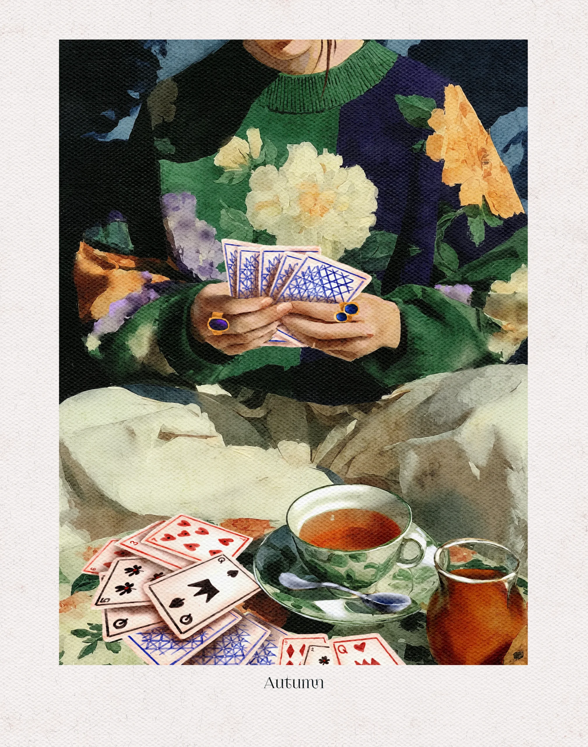 Lubisz ten moment, kiedy jesień zaprasza Cię do stolika pełnego kolorów, gdzie czas płynie spokojniej niż zwykle? To właśnie ta chwila – esencja jesiennego popołudnia zamknięta w kartach do gry i filiżance gorącej herbaty. Kwiaty w tle i ciepły napar tworzą atmosferę domowego komfortu i czekania na gości lub spędzenia dobrego czasu ze sobą.